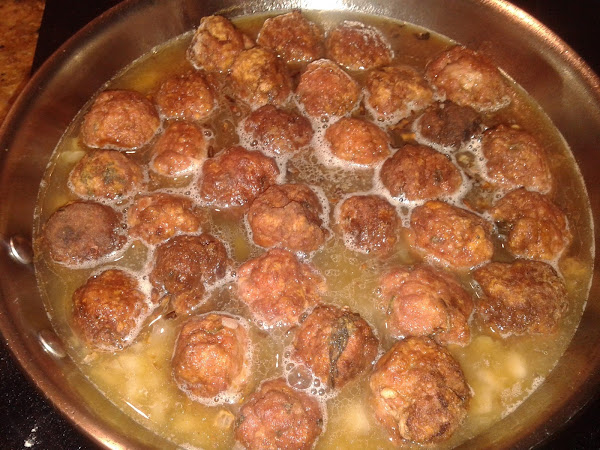 Una vez que la cebolla coge un poco de color añadimos las albóndigas, el vino y cubrimos con agua.