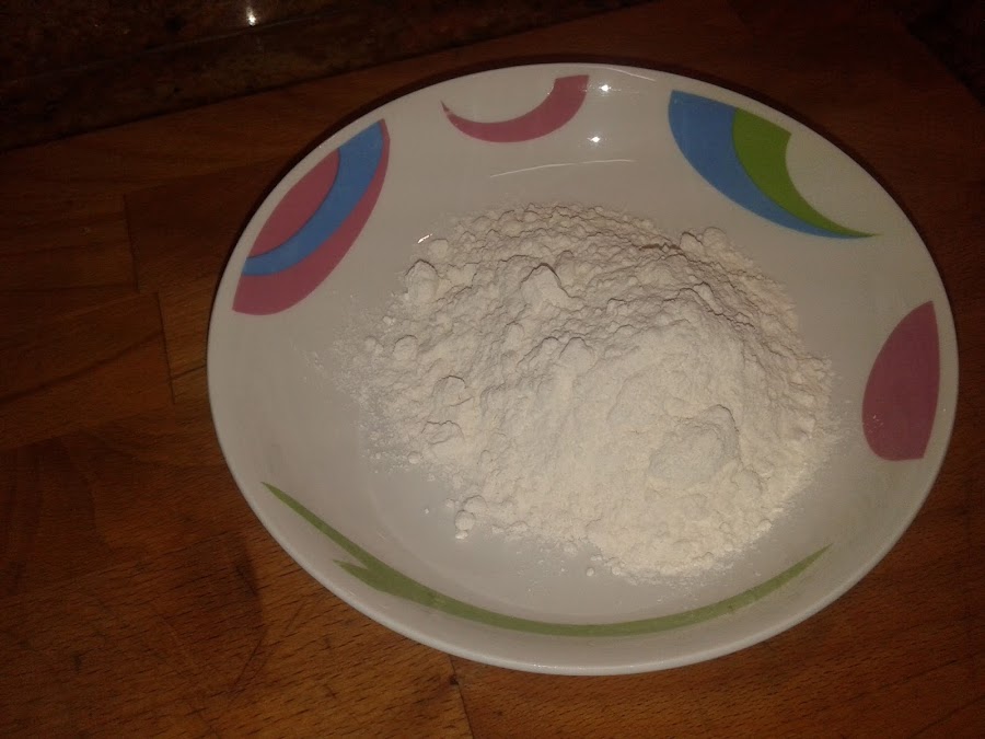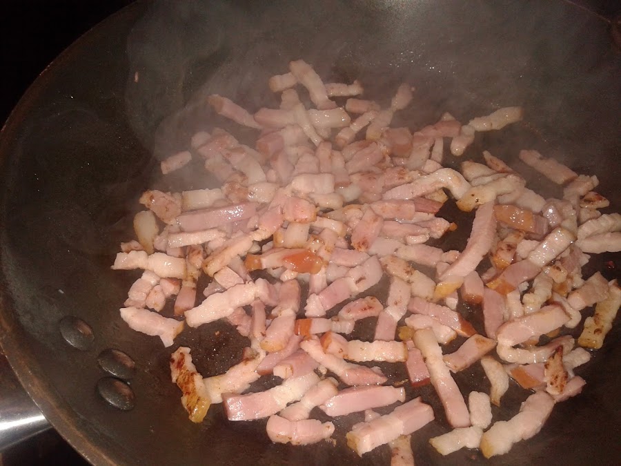 miga de pan remojada en leche,300 ml de nata (crema de leche) líquida, agua para cubrir, 200 gr de bacon ahumado, harina para rebozar y aceite de oliva, sal y pimienta negra molida.