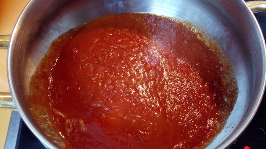 Echamos más o menos la mitad del tomate en una cacerola amplia a fuego medio.
