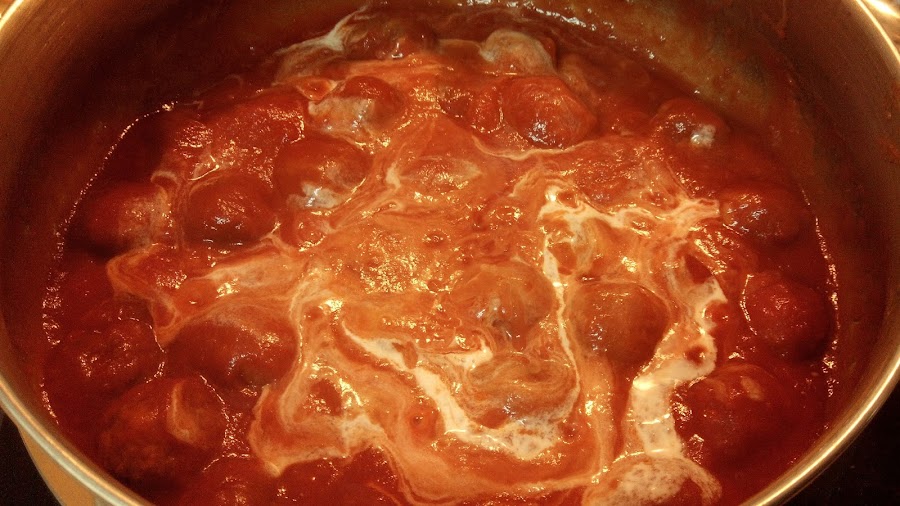 Ahora vamos a añadir la nata (crema de leche), no mucha, unos 50 ml. Removemos muy bien para que las albóndigas queden bien cubiertas y la nata (crema de leche) y el tomate se mezclen bien.