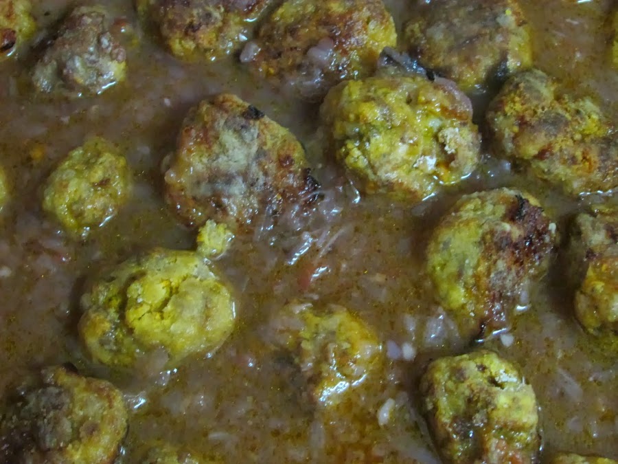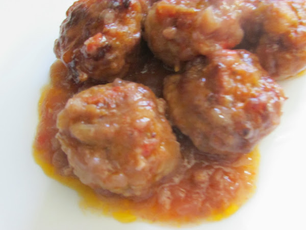 He modificado un poco la receta original, en la salsa he cambiado el vino blanco por tinto y en las albóndigas en vez de freírlas las he cocinado en el horno, han quedado estupendas y no han absorbido nada de aceite, además de que la cocina ha resultado menos afectada, no salpican ni te pringas tanto.
