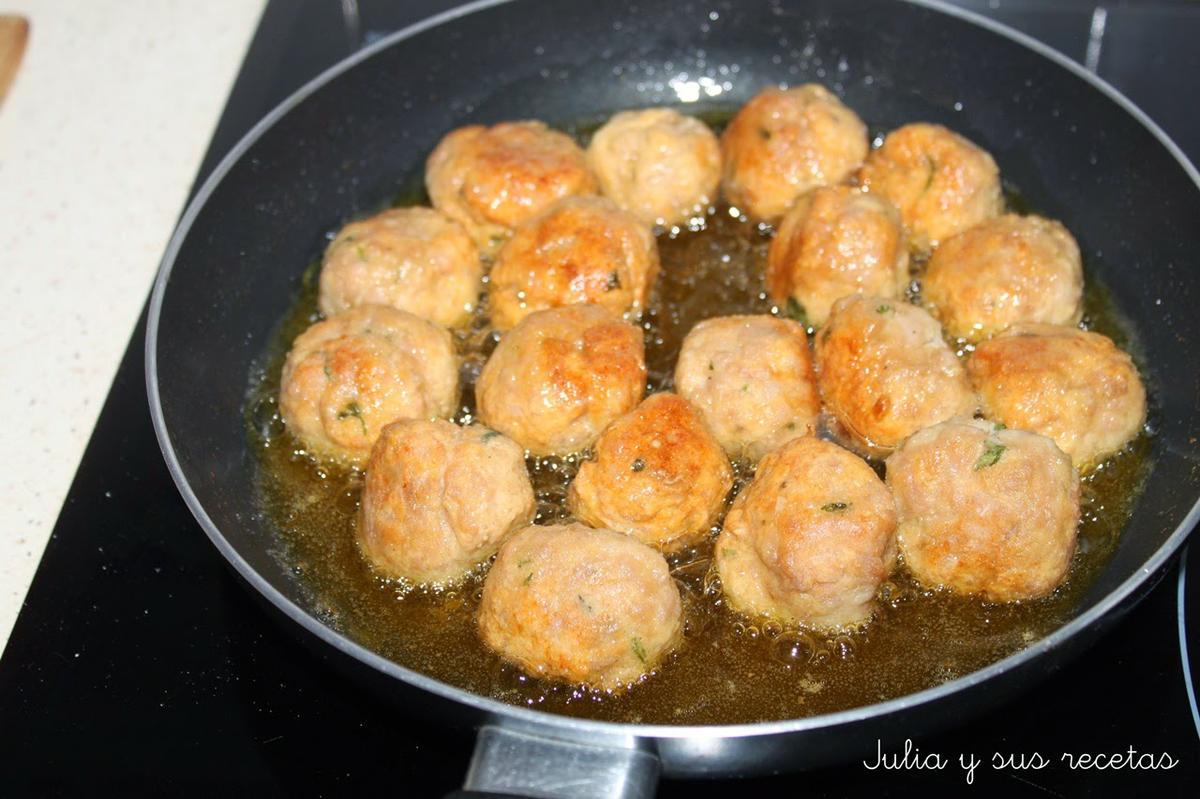 Hacemos las albóndigas, las pasamos por harina y las freímos en una sartén con aceite de oliva. Las ponemos en la olla exprés .