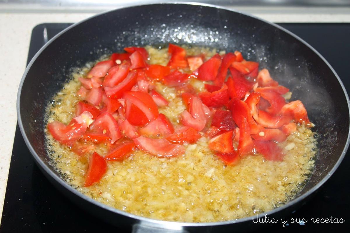 En ese mismo aceite, sofreímos la cebolla picada, el pimiento rojo y el tomate troceados.