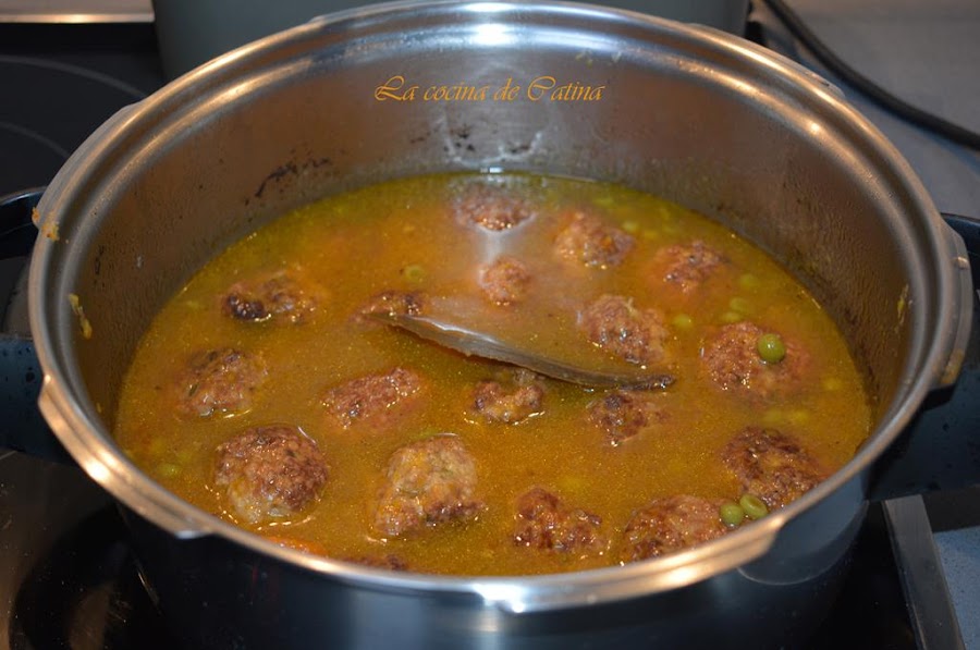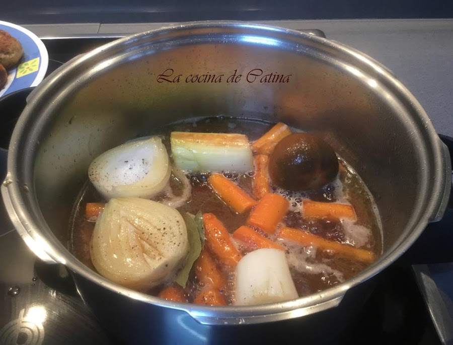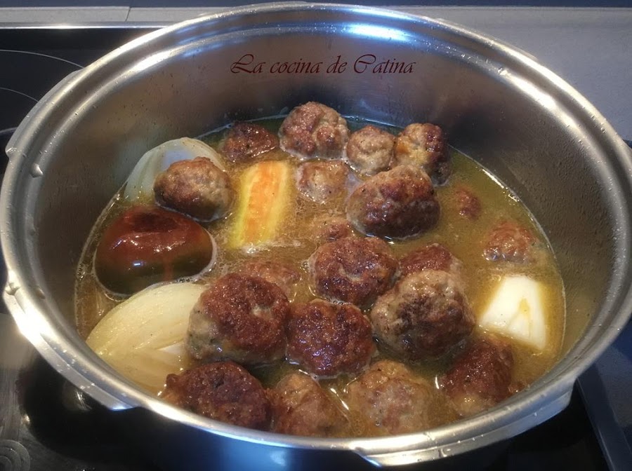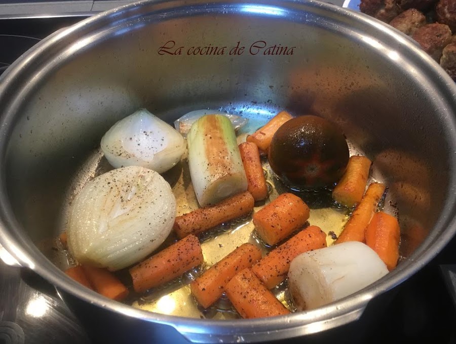 En el mismo aceite, freímos las verduras peladas y cortadas en trozos grandes, le añadimos sal, pimienta, laurel, el agua, el vino y las albóndigas que hemos reservado.