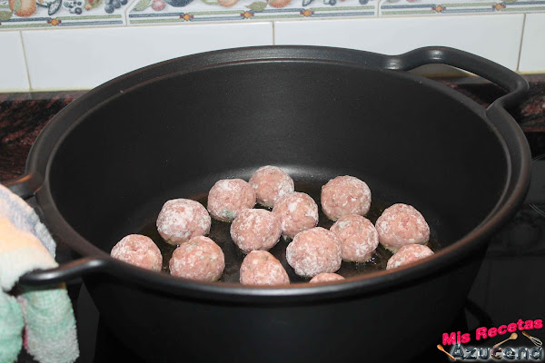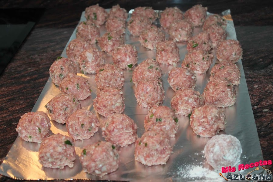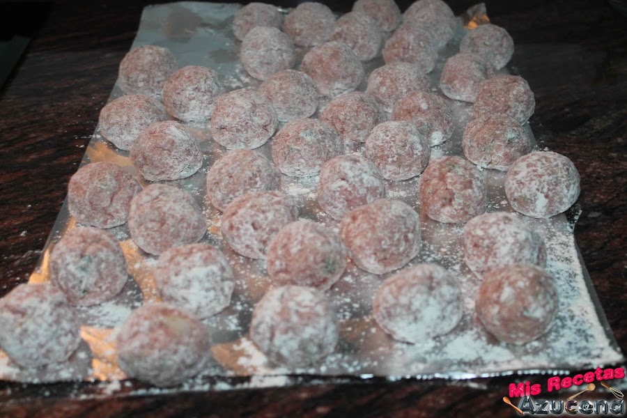 Una vez terminadas las bolitas, ponemos la harina de trigo en un plato y pasamos todas las albóndigas una a una y las sacudiremos para quitarle el exceso de harina, volvemos a colocarlas sobre el papel de aluminio.