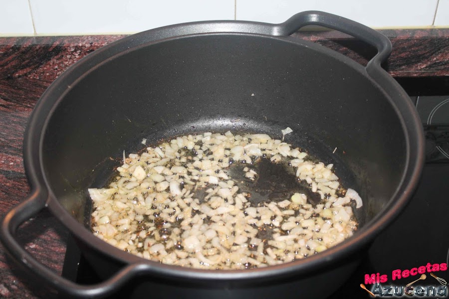 Para la salsa lo primero que haremos será picar la cebolla en cuadraditos pequeños y el ajo lo picaremos menudo.