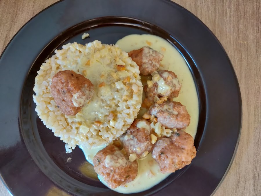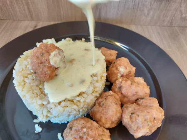 Y éste sería el resultado, un plato de arroz con albóndigas, pero con una salsa ligera y muy poco trabajo.