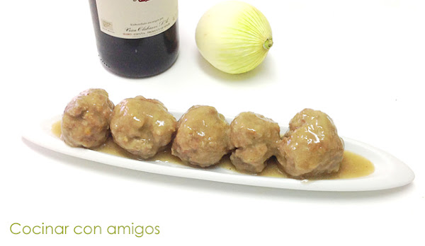 En la olla express (olla presión) echamos un chorrito de aceite, le damos unas vueltas a las albóndigas para sellarlas y las retiramos. En ese mismo aceite pochamos la cebolla en juliana, cuando esté transparente echamos el cognac y dejamos que reduzca, añadimos la cucharadita de harina, removemos y le echamos 2 vasos de agua (probamos de sal y rectificamos si hiciera falta), batimos la salsa y echamos las albóndigas dentro.