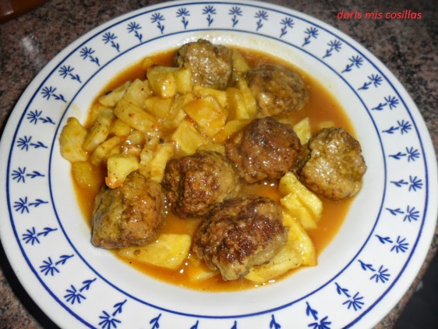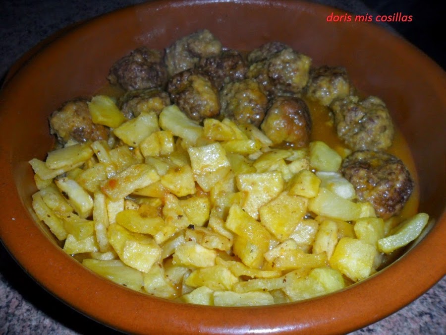 Seguir cocinado la salsa de las verduras con las albóndigas sobre 10- 15 minutos y servir con una buena ración de patatas a cuadritos fritas en abundante aceite de oliva.