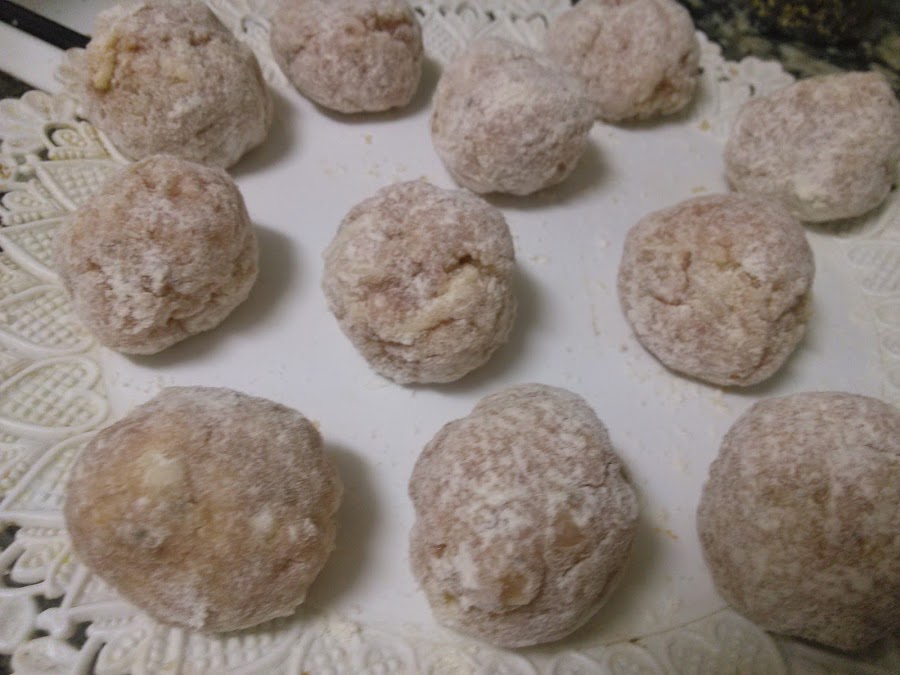 Una vez este todo muy bien integrado hacemos la masa en forma de bolas. Lo más fácil es hacer porciones de 30 gramos, luego dar forma redondita y enharinar para que no se deformen y queden doraditas.