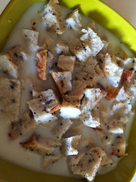 En un bol pequeño, ponemos el pan troceado y lo cubrimos con un vaso de leche y reservamos.