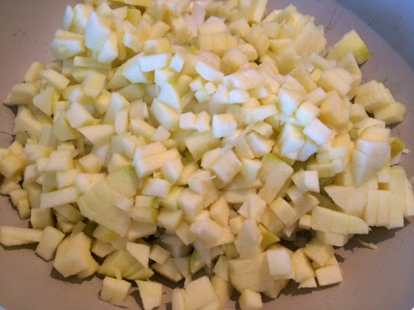 Por otro lado en una cazuela baja, echamos 2 cucharadas de aceite de oliva y ponemos a pochar a fuego medio-bajo las dos cebollas troceadas y las 2 manzanas peladas y troceadas.