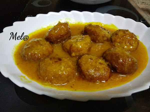 Doramos las albóndigas en un poquito de aceite, apartamos en una fuente y en ese aceite pochamos la cebolla partida muy menuda. Cuando esté blandita la cebolla añadimos las especias: una cucharadita de cada cosa, jenjibre, cúrcuma, curry, pimienta molida, el clavo y la hoja de laurel.