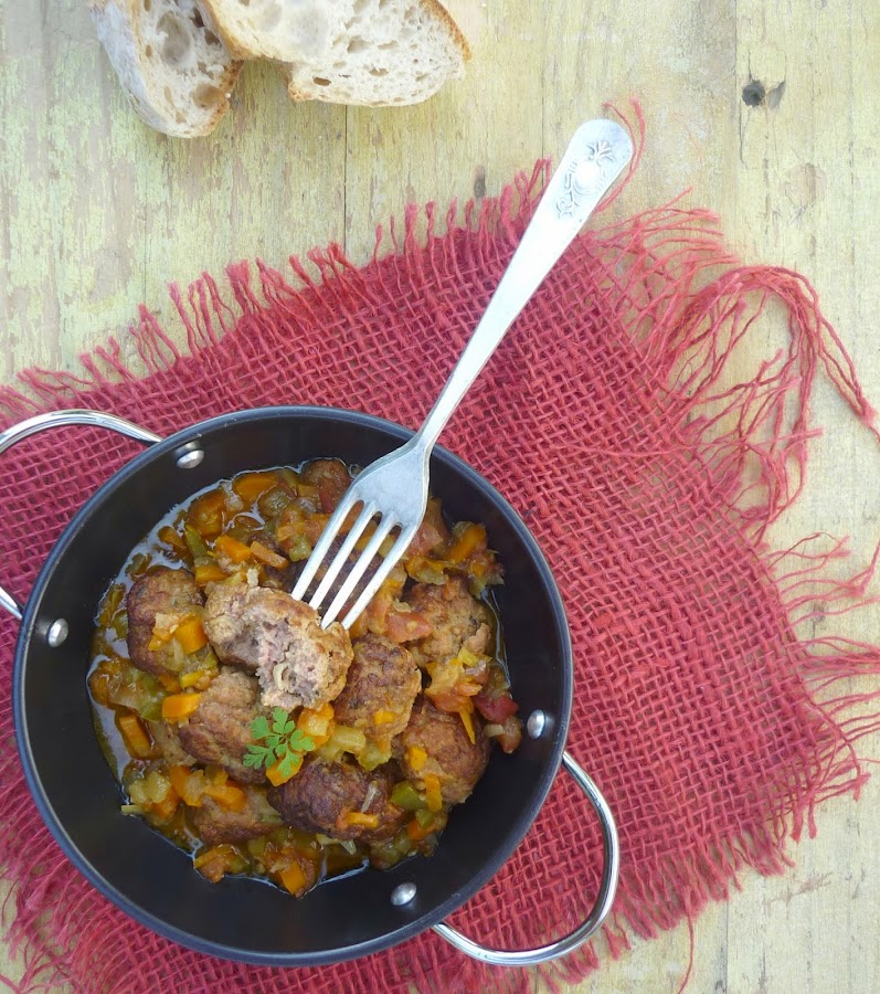 Ponemos el pisto en una cazuela, calentamos y añadimos la sidra. Dejamos unos minutos a fuego fuerte y añadimos el caldo. Dejamos hervir e incorporamos las albóndigas. Bajamos un poco el fuego y dejamos que se haga todo junto unos 10 minutos. Ponemos un toque de sal a la salsa si hace falta.