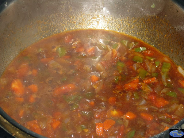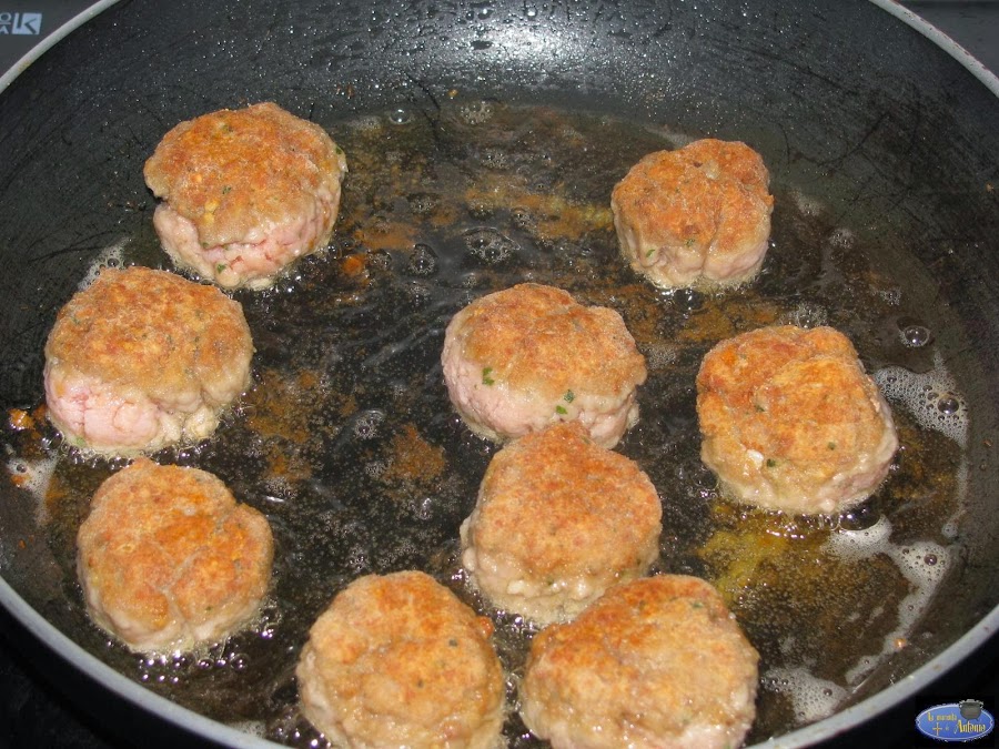 Cuando la cosa tome color le añadimos un buen chorro de salsa de soja baja en sal Kikkoman. No hace falta que le añadáis sal,con la soja será suficiente. Dejamos cocer a fuego lento mientras freímos un poco las albóndigas ligeramente enharinadas.