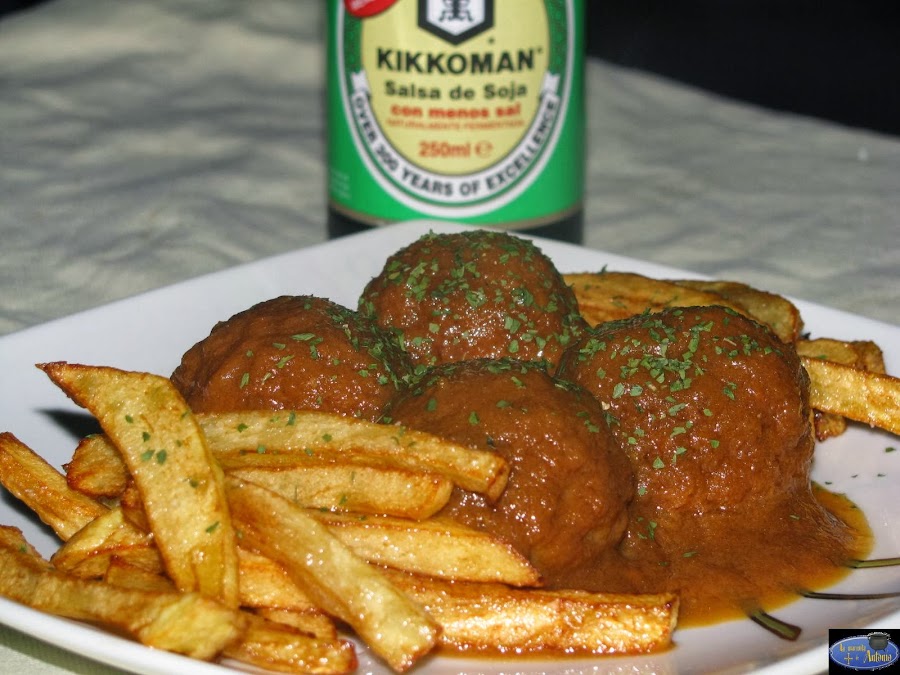 He utilizado la salsa de soja Kikkoman baja en sal ya que al preparar la carne para hacer las albóndigas ya se le sazona con sal, ajo, perejil y así no resulta tan fuerte.Aunque sí nos va a dar ese sabor tan rico y particular de la soja.