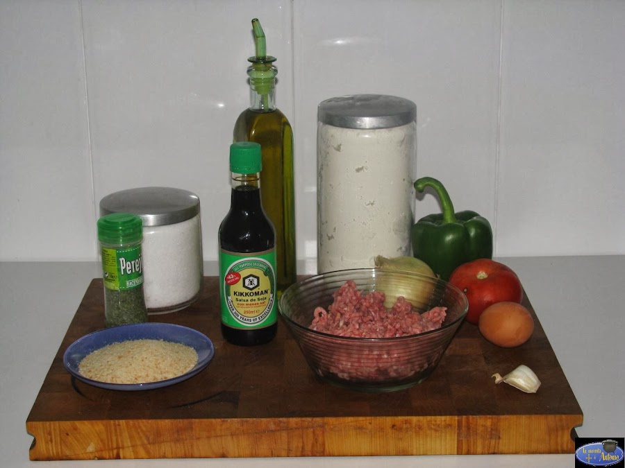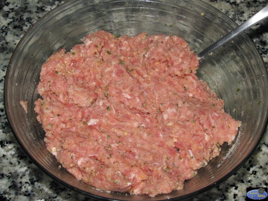 Comenzaremos por arreglar la carne picada con sal, 1 diente de ajo bien picado, 1 huevo batido y un poco de pan rallado para que ligue.