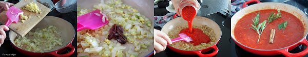 Verter el tomate triturado y añadir las hierbas aromáticas, la canela y el azúcar. Remover bien y dejar cocer unos 10 minutos aproximadamente.