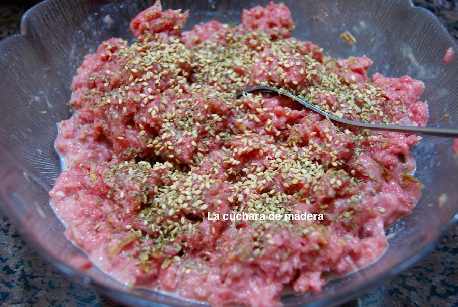 Elaboración:En un bol, ponemos la carne picada, sal, sésamos, leche, huevo , pan y mezclamos