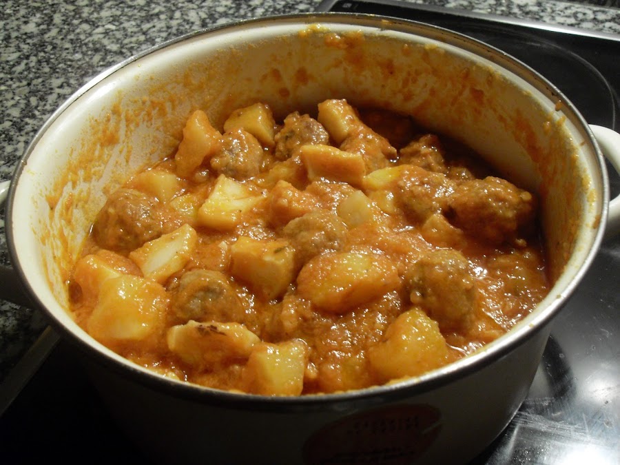 Añadir el majado a la cazuela, el pimentón, remover, agregar el vino y dejar evaporar 5 minutos, seguidamente incorporar el sofrito de tomate, mezclar incorporar la sepia y el caldo de pescado. Dejar cocer y al empezar a hervir añadir las albóndigas y cocinar unos 20 minutos más. Cinco minutos Antes de retirar la cazuela añadir por encima las gambas salteadas.