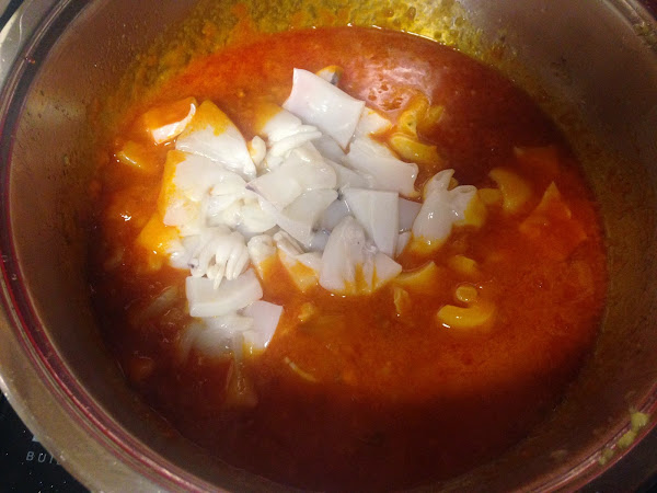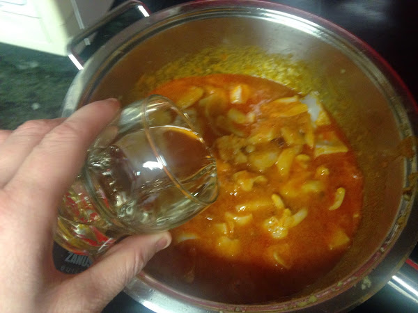 Cuando este echo el sofrito añadiremos la sepia a trocitos removemos todo y lo bañamos con vino blanco.
