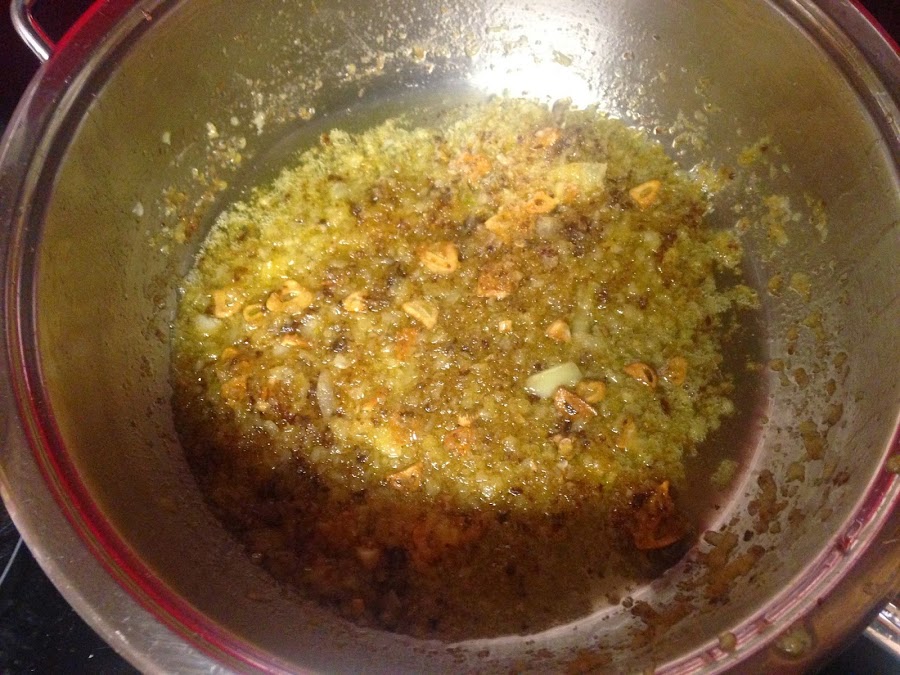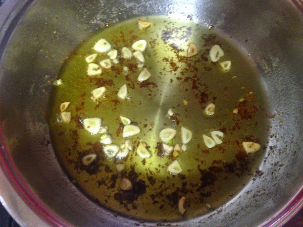 Cuando estén doraditas las apartamos, y en el aceite que ha quedado freimos los dientes de ajo pelados y laminados.