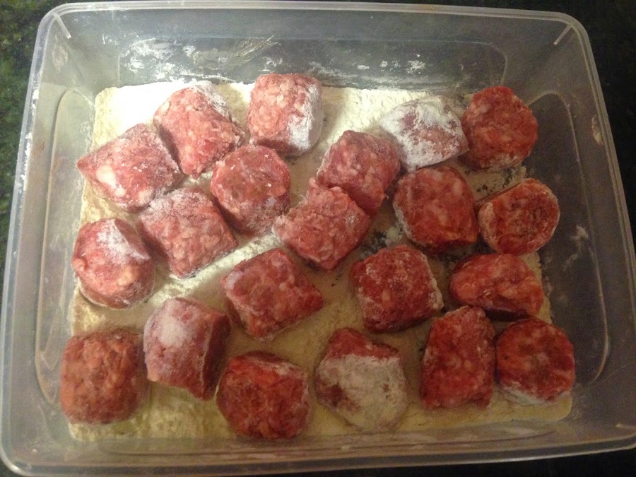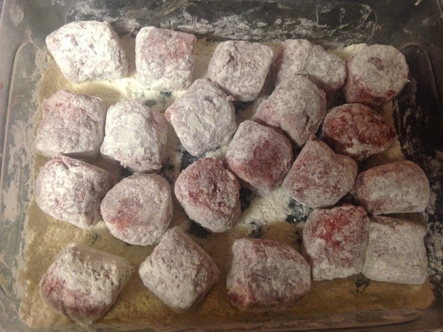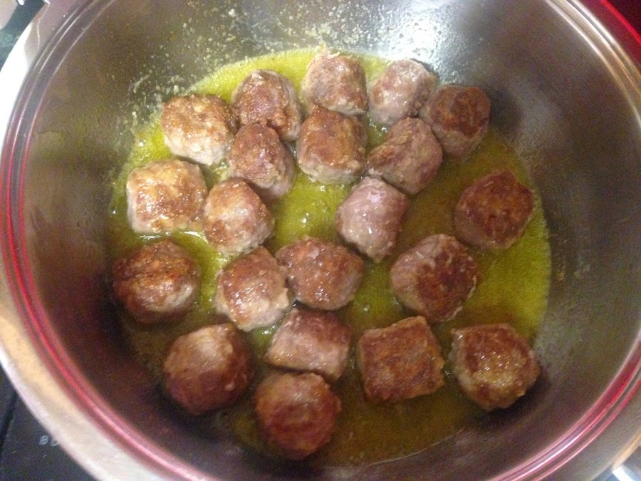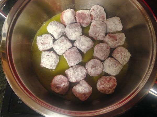 Pondremos una cazuela con aceite de oliva a calentar, mientras pasamos las albondigas ligeramente por harina, y las freimos.