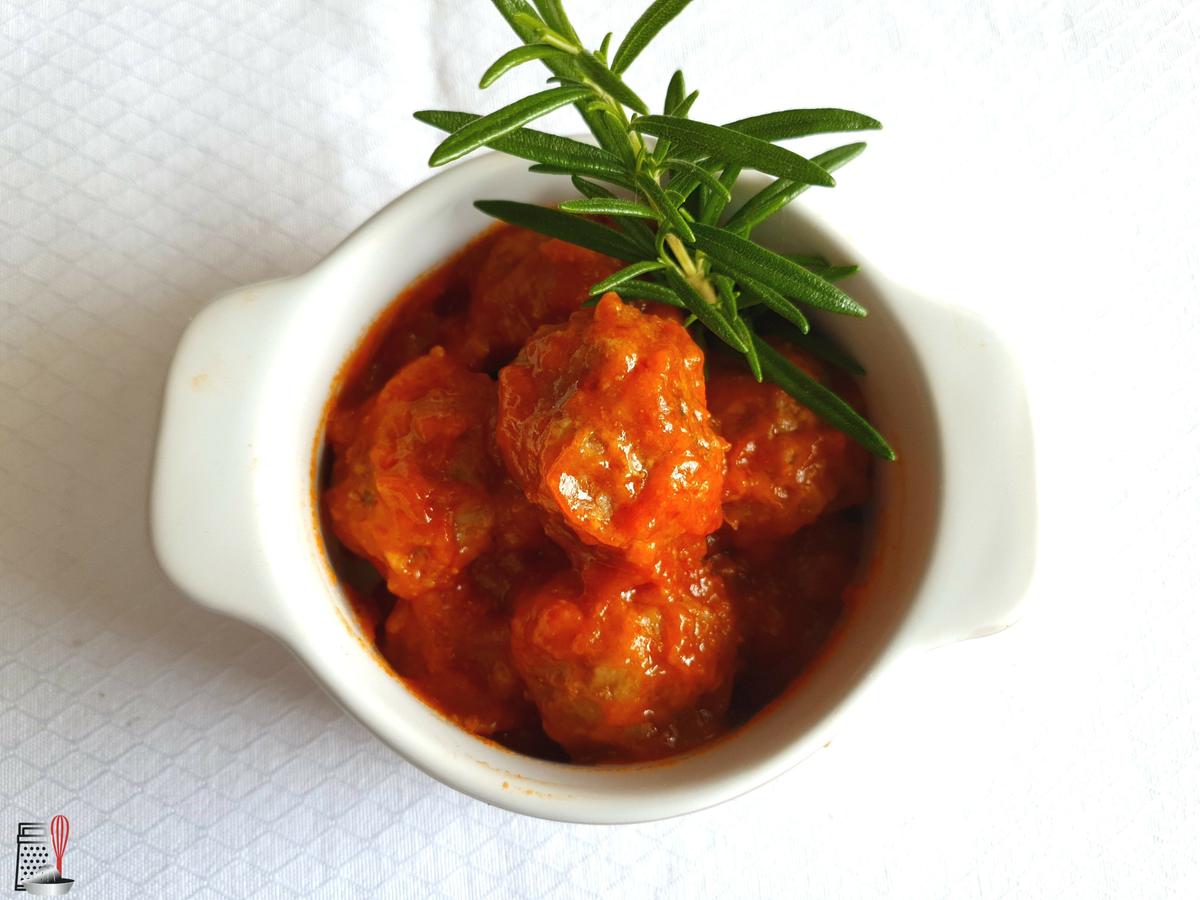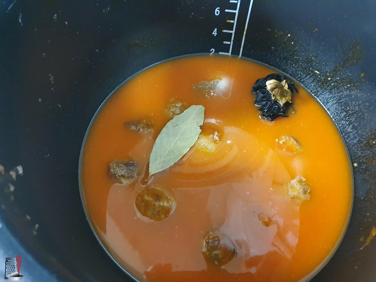 A las albóndigas les he añadido el tomate, el caldo, la ñora entera, el laurel y un poco de sal. He mezclado con cuidado.