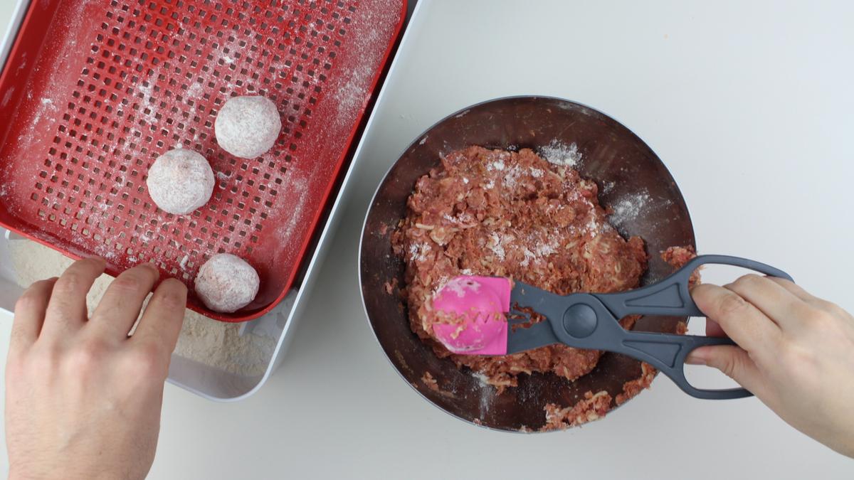 tomamos una porción de carne y la boleamos sobre la palma de la mano, si se te pega la carne en las manos puedes ayudarte con un poco de aceite o agua en las manos. Cuando ya tengas la bola hecha rebozamos por harina, y reservamos.