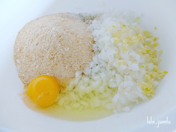 A continuación, ponemos pan rallado con el huevo, la cebolla, el ajo, la sal y la pimienta en un bol y mezclamos bien.