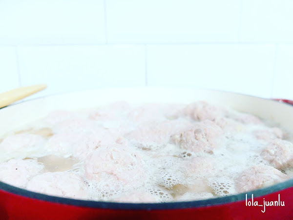 Vertemos en una olla el agua y el caldo, la ponemos al fuego y los llevamos a ebullición. Agregamos las albóndigas y dejamos cocer a fuego lento durante 5 o 10 minutos, dependiendo del tamaño de nuestras albóndigas. Transcurrido este tiempo, retiramos las albóndigas del caldo y reservamos ambos.