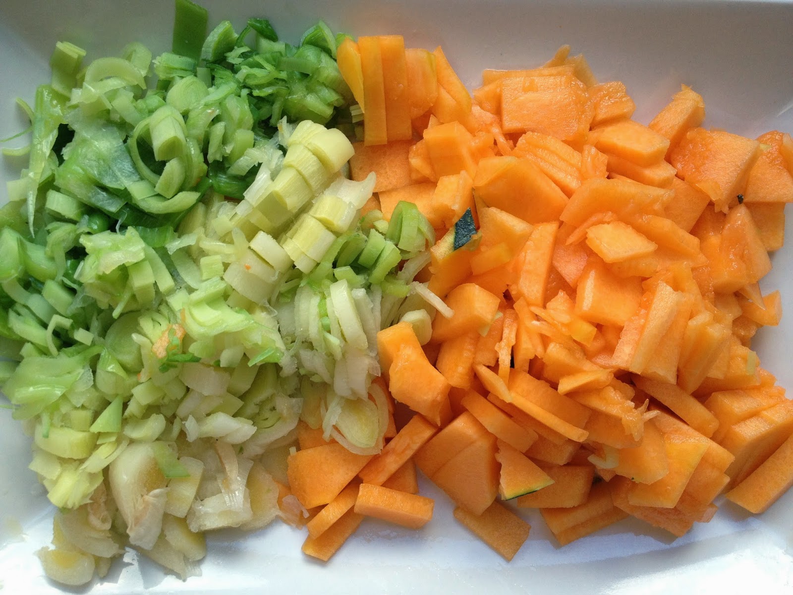 4 Mientras, cortamos la calabaza en cachos pequeños y los 100 Gr de puerro , a continuación ponemos a calentar una cazuela con 1 cuchara de aceite,añadimos las verduritas cortadas y agua , que quede 2 dedos por encima de las verduras.