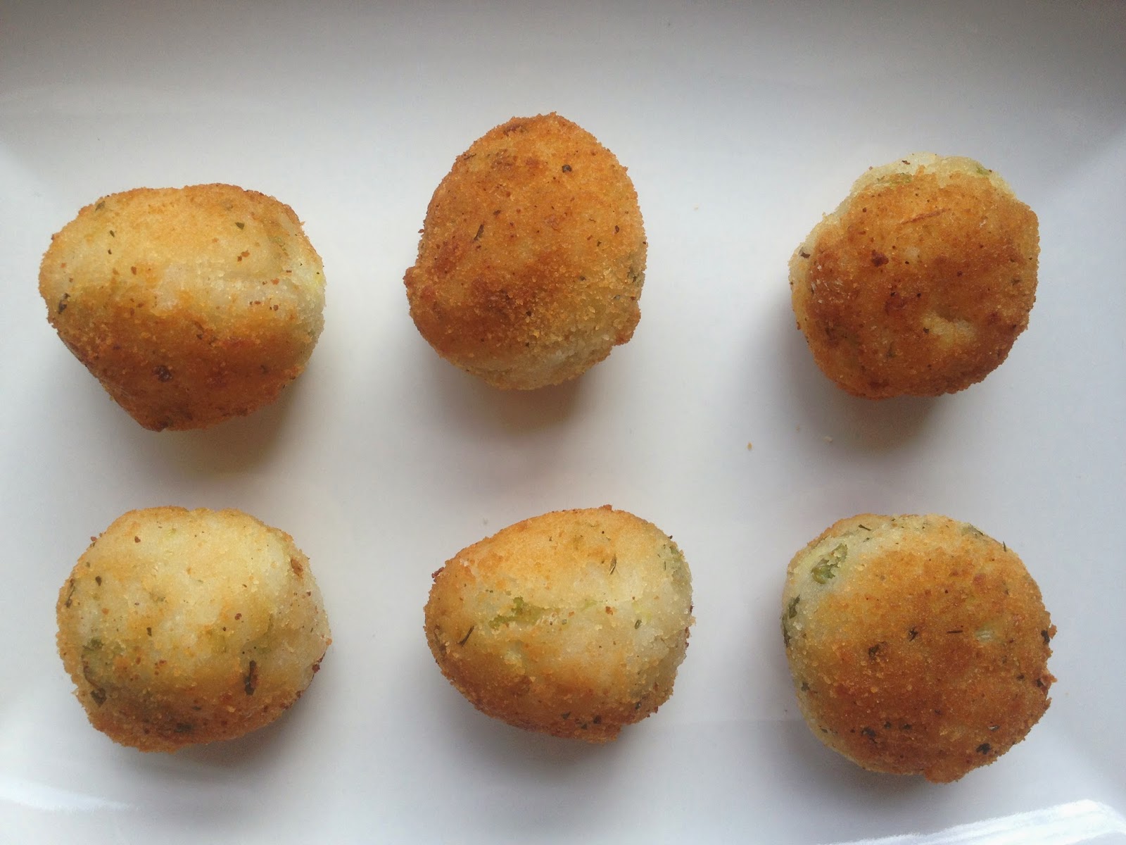 6 Una vez formadas las bolas, ponemos a calentar la sartén con bastante aceite, cuando este caliente , vamos incorporando las bolas de arroz y dejamos que se doren, sacándolas después a un plato .