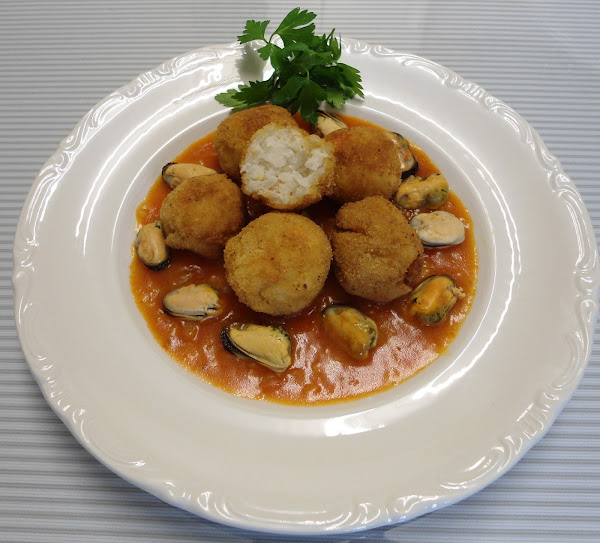 Coloca las albondigas en un plato con los mejillones y la salsa y listo.
