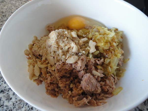 Cortamos la cebolla en brunoise y la ponemos a dorar en un poco de aceite. En un bol ponemos el atún bien escurrido, he incorporamos unos trocitos de almendra tostada ( o cualquier fruto seco que os apetezca), le dará un toque crujiente muy rico a la mezcla, incorporamos la cebolla refrita y escurrida, un huevo y un poco de pan rallado. Mezclamos bien, formamos las "bolitas", pasamos por huevo batido y pan rallado y freímos, y reservamos sobre papel de cocina. Las podemos servir sobre una base de salsa de tomate, o tomar ya templadas que también están muy buenas.