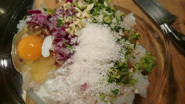 Picamos finamente el bacalao desalado (y sin espinas ni piel, faltará más), la cebolla, el cilantro y el ajo. Lo añadimos al bol.