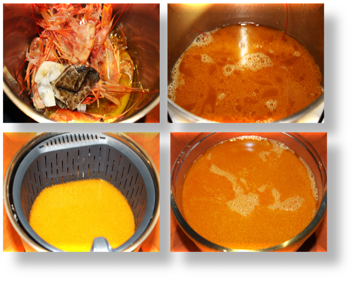 Prepara un fumet con las cabezas y cáscaras de gambas con: 100 gr. de aceite, la piel del bacalao que habías reservado y 1000 gr. de agua. Puedes hacer mi receta de fumet que queda deliciosa: fumet. El fumet que sobre, lo podrás congelar para otra ocasión.