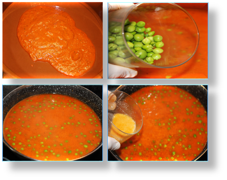 Seguidamente incorpora la salsa triturada en una cazuela de barro o sartén. Añade los guisantes y el fumet. LLEVA A EBULLICIÓN unos 10 MINUTOS.