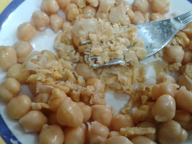 Los garbanzos también los machacamos y los ponemos en un recipiente junto con las patatas.