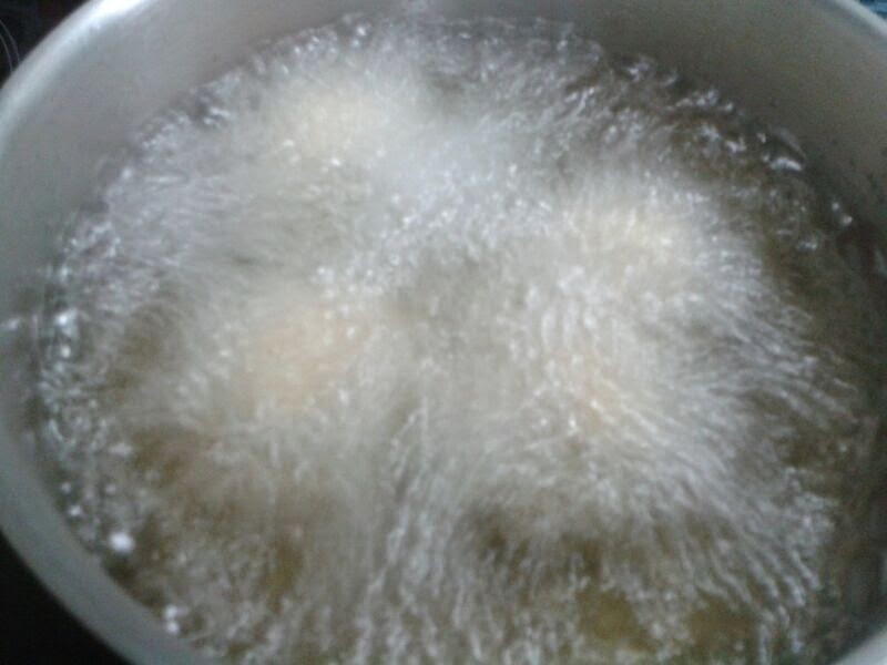 Echamos en la sartén el "majaíllo" y el caldo de pescado. Dejamos hervir unos minutos a fuego muy suave para que no se nos rompan las albóndigas.