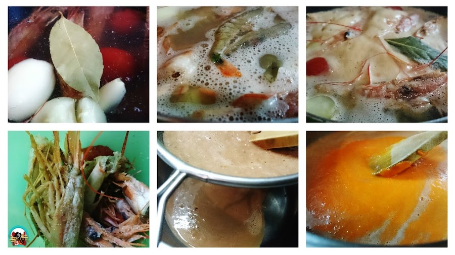 Caldo de langostinos casero; varias cabezas de langostinos.