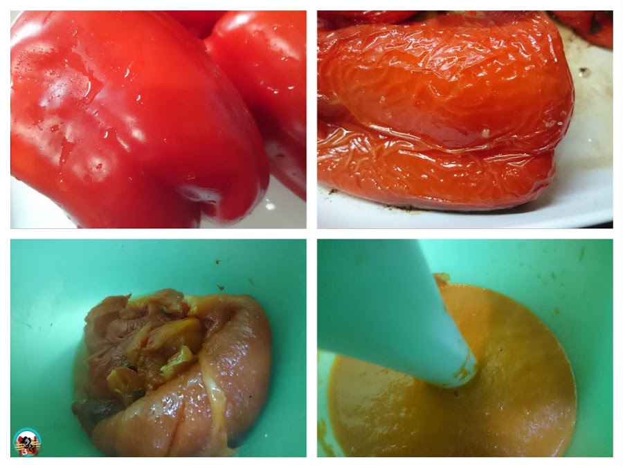 1.- Asamos los pimientos: Lavamos los pimientos y secamos. rociamos con un poco de aceite de oliva y un poco de sal. Horneamos 40 minutos a 180ºC. Los dejamos templar le quitamos la piel, las membranas y las semillas. Trituramos con la batidora. Reservamos