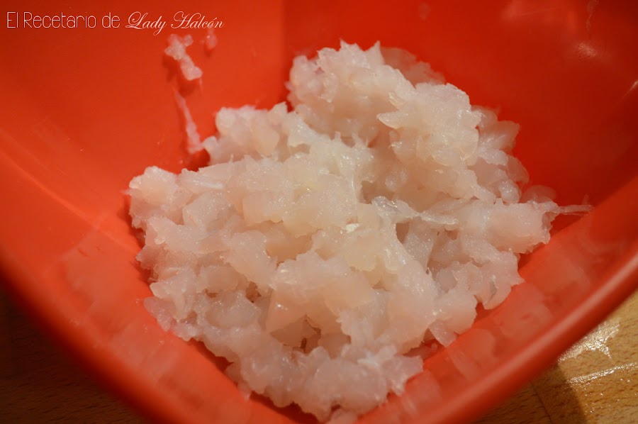 Quita la piel al bacalao, desmígalo o pícalo muy fino y colócalo en un bol.