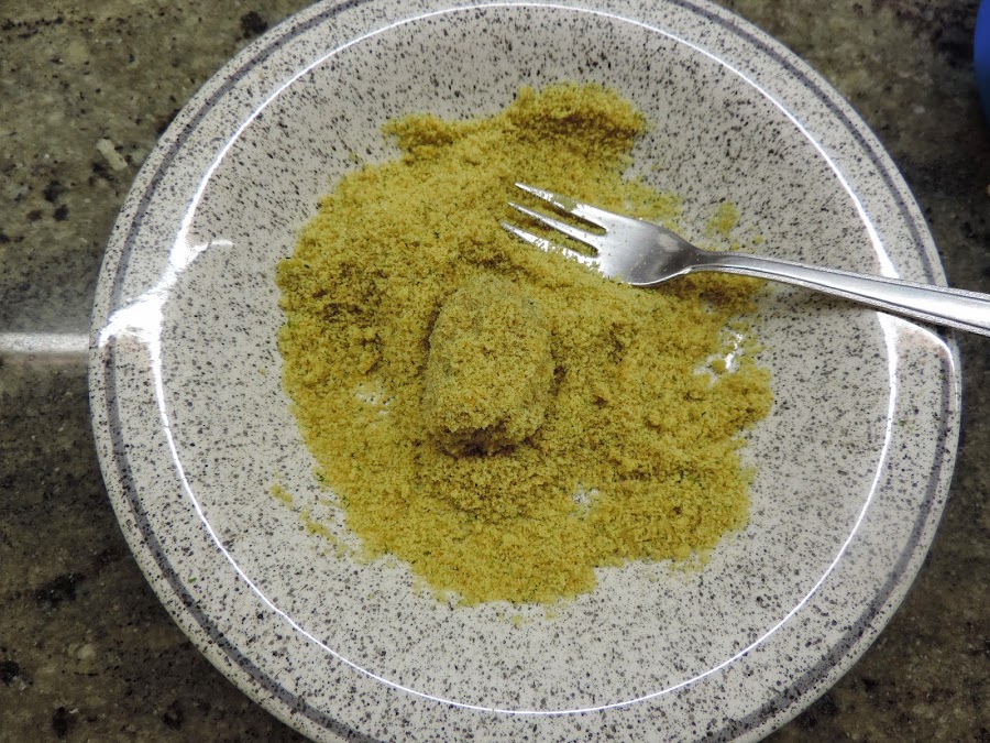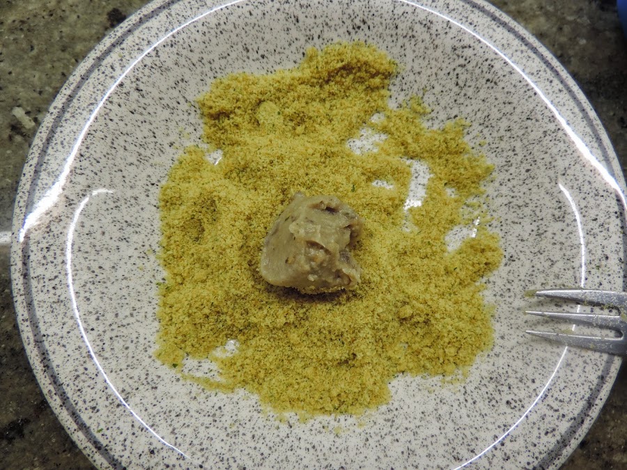 Poner un poco de pan rallado en un plato, cojemos con una cuchara un poco de masa y la rebozamos, La masa es muy blanda.