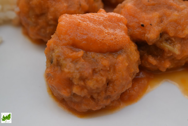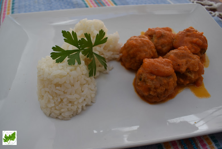 Incorpora la salsa a las albóndigas reservadas en la cazuela y deja cocer unos minutos a fuego lento, mueve la cazuela para que las albóndigas queden bien bañadas en la salsa.Sirve acompañadas de arroz blanco.