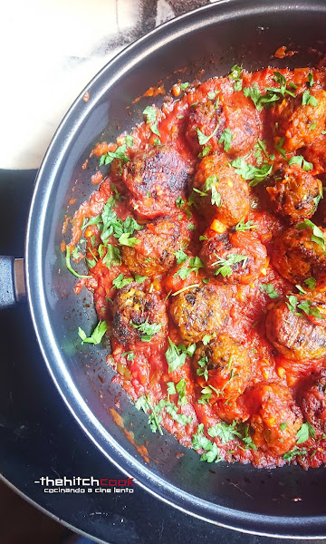 Vuelca las albóndigas en la sartén de la salsa Marinara y remueve con cuidado para que se vayan mezclando y cogiendo el aroma de la salsa. Termina picando un poco de perejil fresco y se lo espolvoreas por encima al conjunto final.