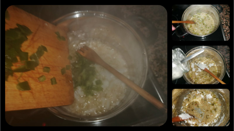 Ahora es el turno de la salsa, la inventé sobre la marcha, como cualquier otra salsa sencilla para pescado o similar, picamos la cebolla, el pimiento verde y el ajo y ponemos a pochar en un poco de aceite, dejamos pochar y cuando esté bien, añadimos 2 o 3 cucharadas de harina, dejamos hacerse sin dejar de remover