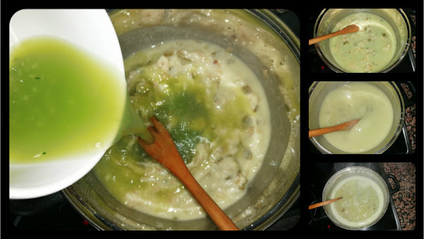 Añadimos poco a poco el líquido que soltó el calabacín sin dejar de remover, hasta conseguir una textura líquida, si no hay suficiente líquido, completamos con un poco de agua, ponemos una pizca de sal y dejamos hacerse unos minutos