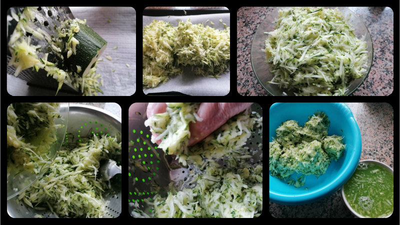 Lo primero lavamos bien el calabacín y lo rallamos entero por la parte más gruesa del rallador, el resultado lo ponemos en una fuente y metemos al microondas unos minutos, 5 aprox. También se puede dejar en el escurridor con sal y dejar que pierda el agua, más rápido es metiendo al microondas.