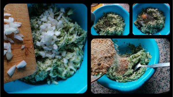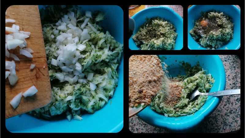 Una vez bien escurrido, le añadimos la cebolla picada, utilicé media (depende del tamaño), luego añadimos la pimienta, el perejil, el sal, el huevo o huevos (depende de cantidad) y por último el pan rallado que es lo que ayuda a ligar la masa junto con el huevo. Al ser un calabacín grande pensé que me llevaría 2 huevos, pero al final fue suficiente uno.